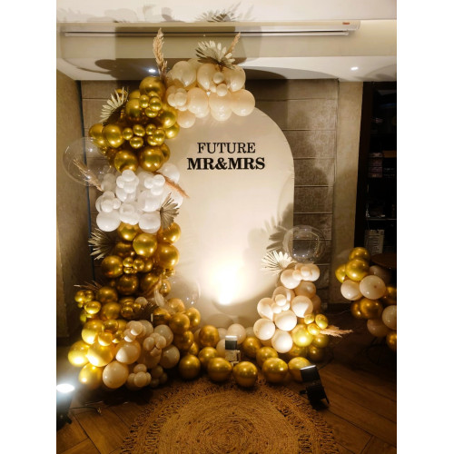 Make your proposal unforgettable with our Romantic Proposal Balloon Decoration in Jaipur, designed to create the perfect moment for a heartfelt “Yes.” This elegant setup features a premium round backdrop with “Future Mr & Mrs” typography, styled with organic balloon clusters in metallic gold, ivory, and pearl white shades. Transparent bubble balloons, dried palm leaves, and pampas grass accents add a soft, romantic charm, while warm spotlight lighting enhances the emotional atmosphere.